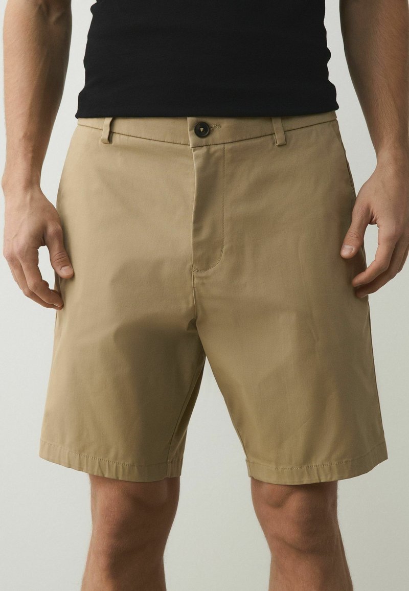 Homme portant un short beige jusqu'aux genoux et un haut noir sans manches, debout, les mains détendues le long du corps, devant un fond uni.