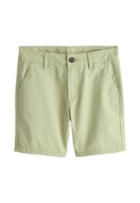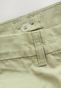 Shorts vert clair en tissu à texture lisse, dotés de deux poches latérales et d'une fermeture frontale à bouton.