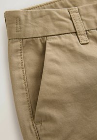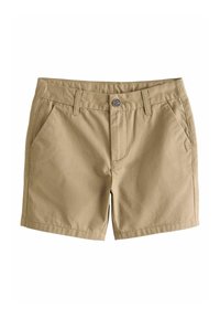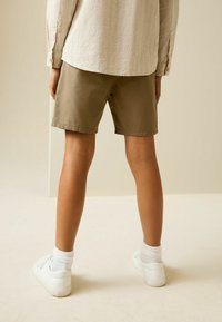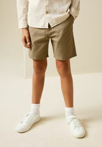 Shorts kaki en coton tissé, avec une taille plate, deux poches latérales, une fermeture à bouton et une texture lisse.