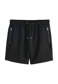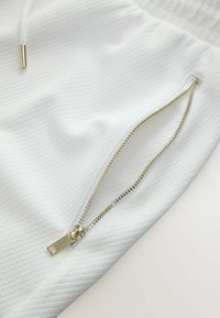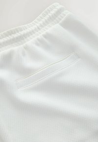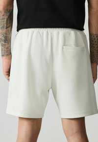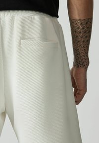 Homme portant un short blanc texturé et une chemise rose à motifs, montrant ses avant-bras et mains tatoués sur les côtés.