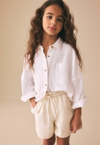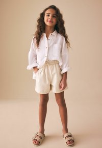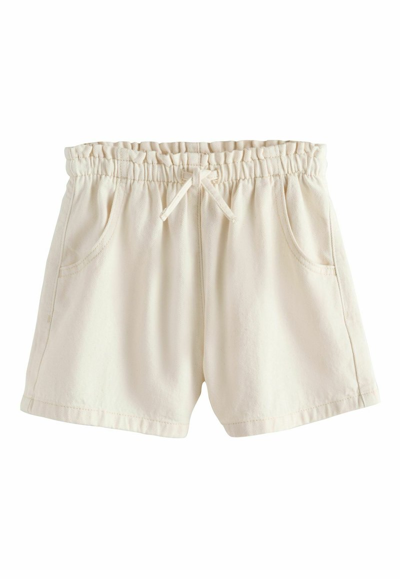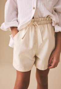 Shorts en coton beige avec ceinture élastique et cordon de serrage, dotés de deux poches avant et d’ourlets cousus.