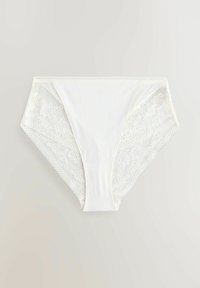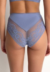 Femme portant un soutien-gorge côtelé bleu et une culotte taille haute avec des panneaux en dentelle florale, debout devant un fond blanc uni.