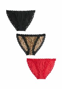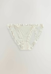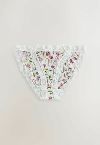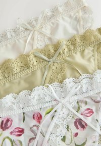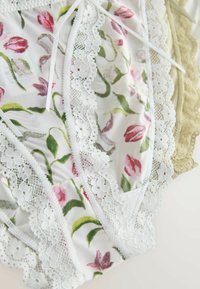 Trois culottes bikini femme avec bordure en dentelle beige, blanc et blanc à motif floral rose, posées à plat sur fond blanc.