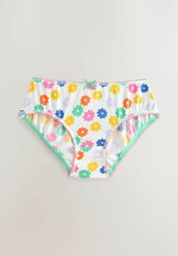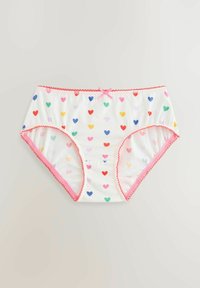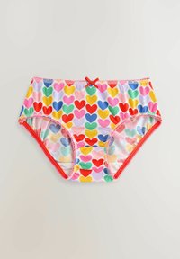 Dix paires de sous-vêtements colorés pour enfants avec des motifs de cœurs, de fleurs et de rayures disposés en diagonale en couches.