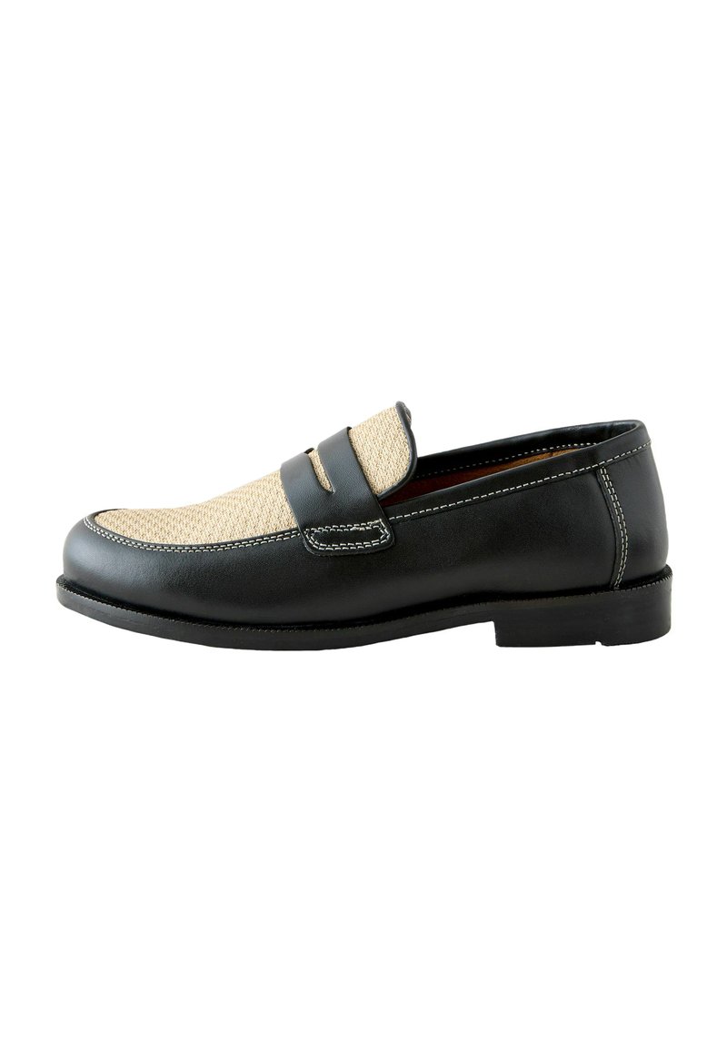 Mocassin en cuir noir et tissu tissé beige avec détail de bride, couture apparente et talon bas, présenté en vue latérale sur fond blanc.