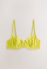 Femme aux longs cheveux foncés assise sur une surface claire, portant un soutien-gorge en dentelle jaune et une culotte assortie, regardant vers le bas avec une expression détendue.