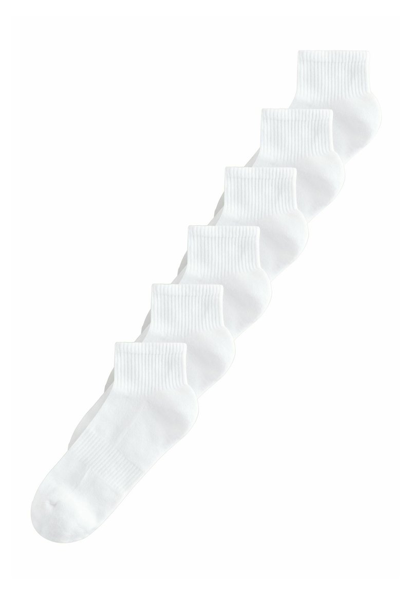 Six chaussettes blanches jusqu'à la cheville avec des bordures côtelées disposées en diagonale sur un fond blanc.