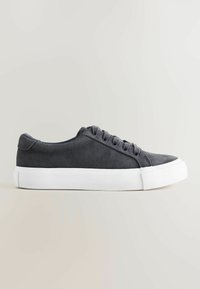 Baskets basses en daim gris foncé avec semelle épaisse en caoutchouc blanc et lacets gris assortis, vue latérale sur fond blanc.