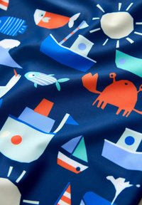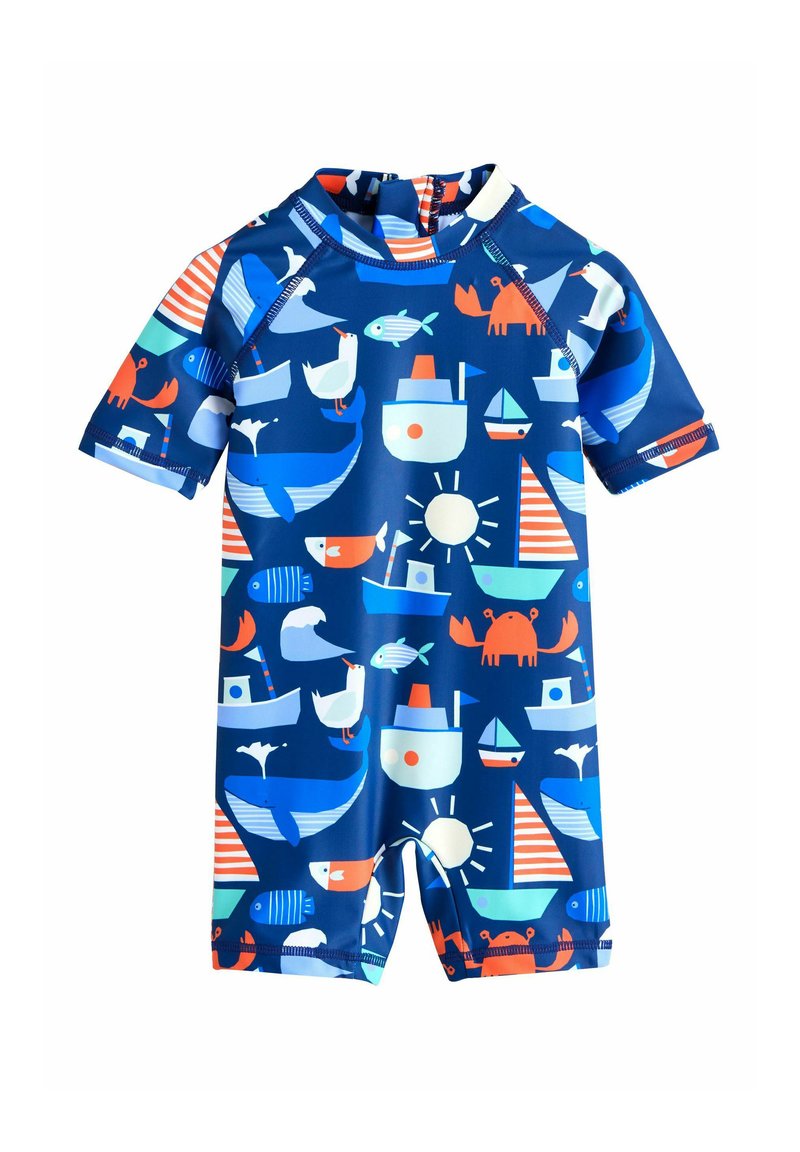 Maillot de bain pour enfants à manches courtes bleu avec des imprimés marins orange et blancs comprenant des baleines, des crabes, des bateaux, des poissons, des mouettes et un soleil.