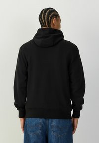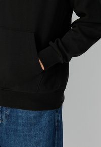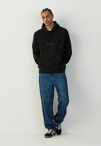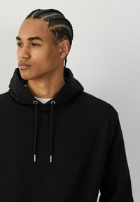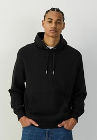 Jeune homme aux cheveux tressés portant un sweat à capuche noir et un jean bleu, debout les mains dans les poches devant un fond uni.