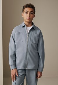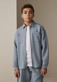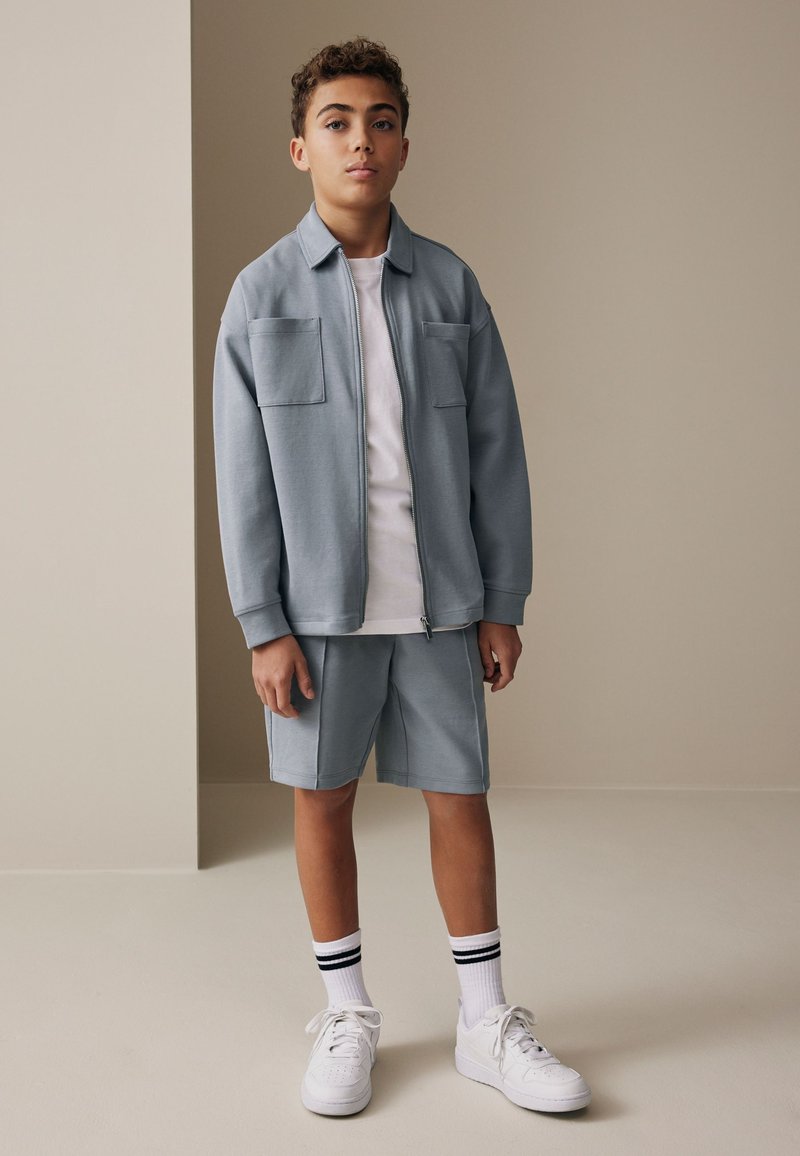 Adolescent debout à l'intérieur portant une veste zippée bleu clair avec poches poitrine, un short assorti, un t-shirt blanc, des chaussettes rayées et des baskets blanches.