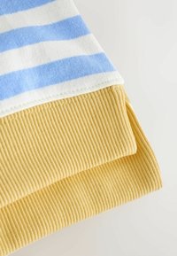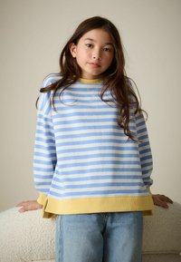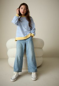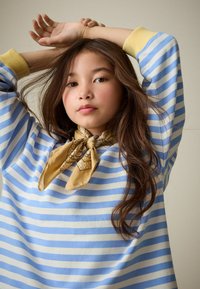Pull oversize rayé bleu et blanc avec des poignets jaunes, associé à une écharpe marron à motifs nouée autour du cou. Cheveux longs et ondulés.