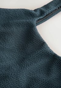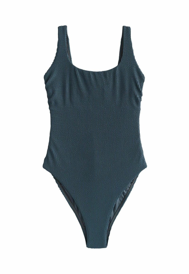 Maillot de bain une pièce texturé bleu sarcelle foncé avec larges bretelles et encolure arrondie, présenté sur un fond blanc.