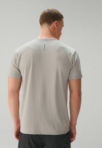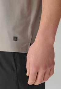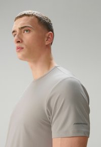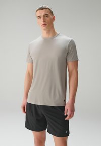 Jeune homme debout, face à l'avant, portant une chemise à manches courtes gris clair et un short noir, sur un fond gris uni.