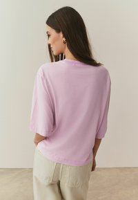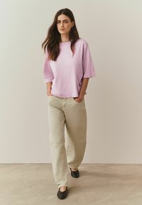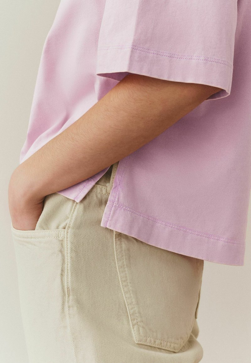 Personne portant une chemise mauve clair à manches courtes avec la main dans la poche d'un pantalon beige, recadrée pour montrer la taille et le bras.