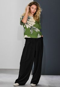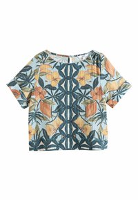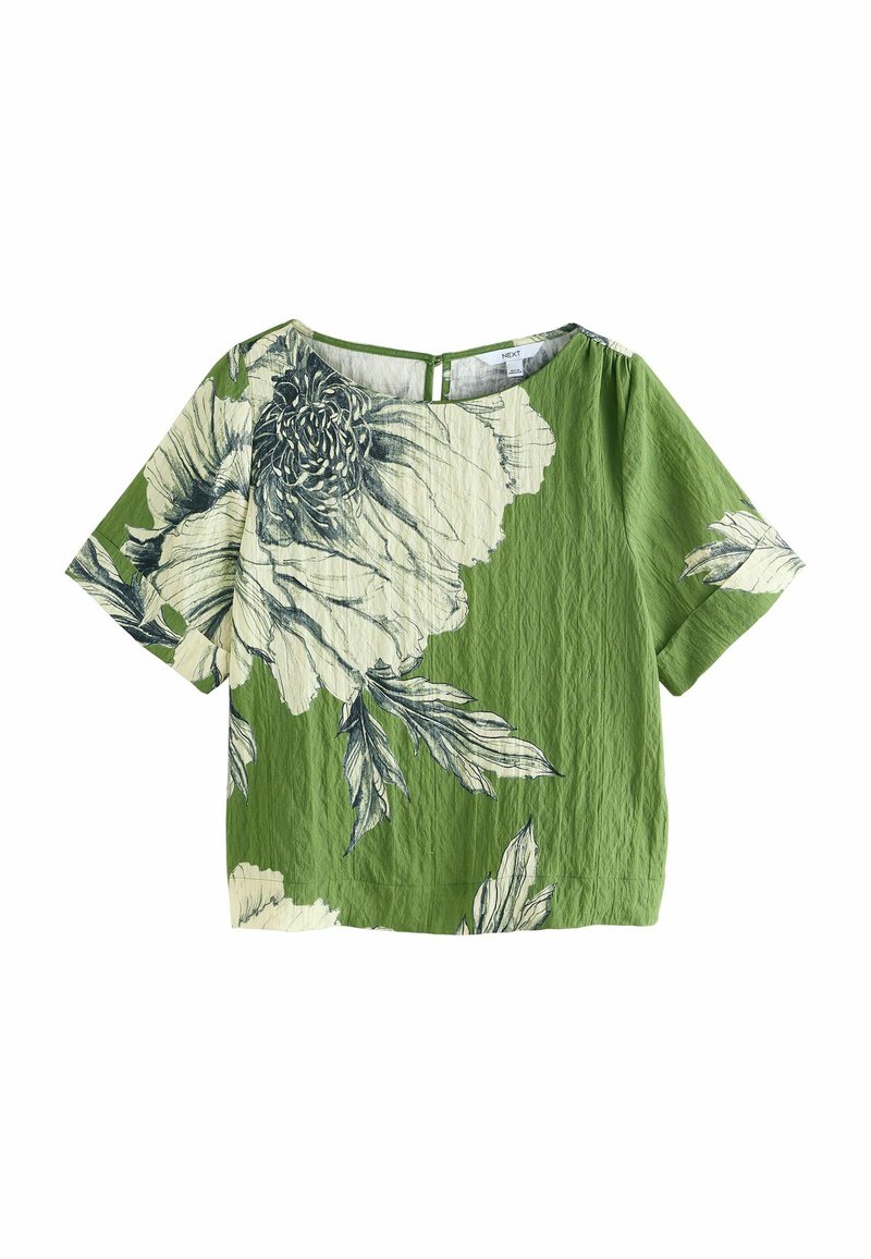 Haut vert à manches courtes avec un tissu texturé froissé. Présente de grandes impressions florales bleu marine et une fermeture au dos en forme de trou de serrure.