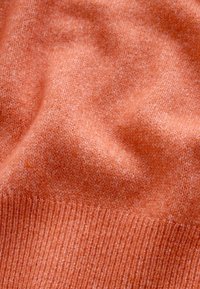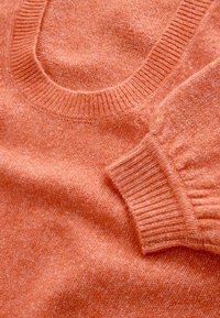 Pull à manches courtes texturé de couleur orange vif avec un col rond et des manches bouffantes. Ourlet et poignets côtelés. Tissu doux et tricoté.