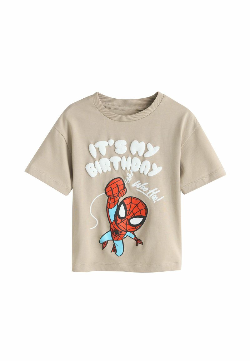 T-shirt beige pour enfant avec Spider-Man en dessin animé en train de se balancer, accompagné du texte « C'est mon anniversaire » et « Youpi ! » en police blanche.