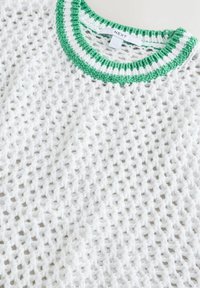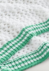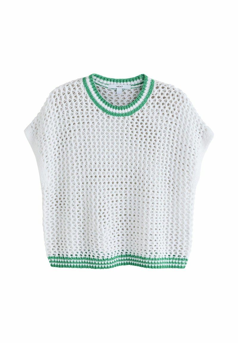 Haut blanc à manches courtes en maille ajourée avec col et ourlet côtelés verts et blancs, étiquette visible à l'intérieur du col.