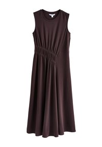 Robe sans manches rose en tissu doux, avec une taille froncée et une jupe fluide avec des détails sur les coutures latérales pour plus de texture.