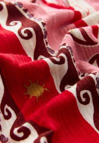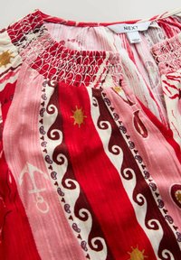 Blouse à manches courtes rouge et rose avec des motifs mélangés de paisley, soleil et nautiques, dotée d'un col rond froncé et d'un tissu léger.