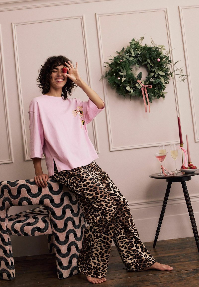 Femme en chemise rose et pantalon léopard assise pieds nus sur une chaise à motifs, tenant une fraise au-dessus d'un œil près d'une couronne de fête et d'une table avec des boissons.