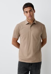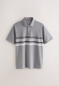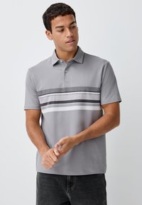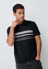 Trois polos à manches courtes en noir, beige et gris, présentant des rayures horizontales de différentes nuances sur la poitrine.
