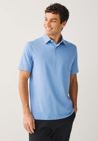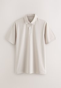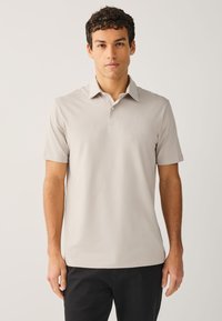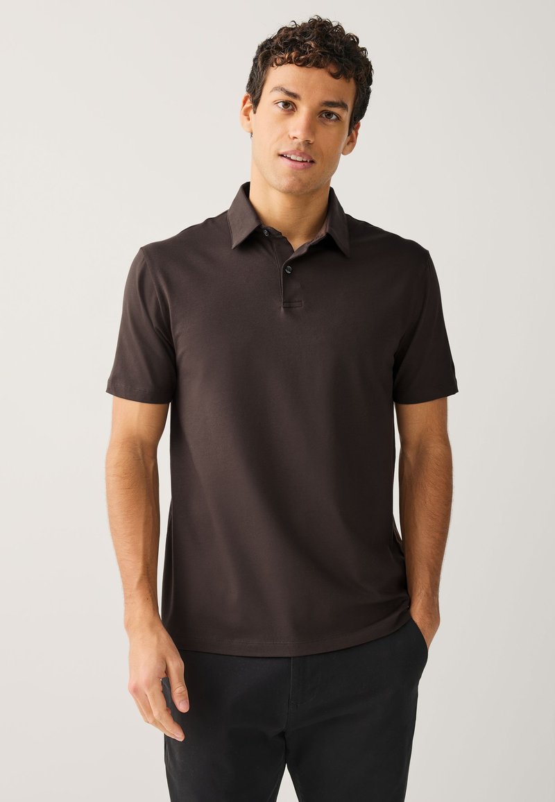 Jeune homme aux cheveux bouclés portant un polo à manches courtes marron foncé et un pantalon noir, debout devant un fond uni clair.