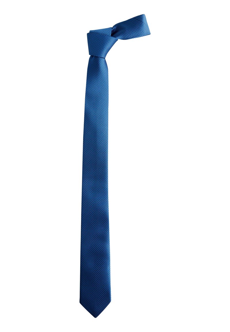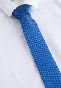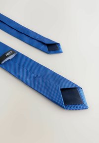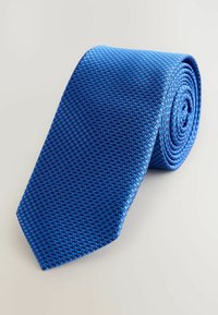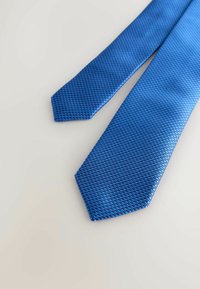 Cravate bleue texturée nouée en un nœud lâche sur fond blanc.
