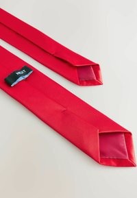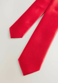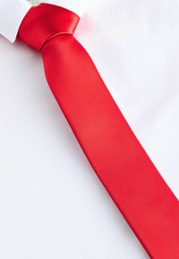 Cravate en soie rouge vif avec un nœud Windsor, présentée sur fond blanc.
