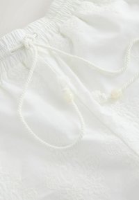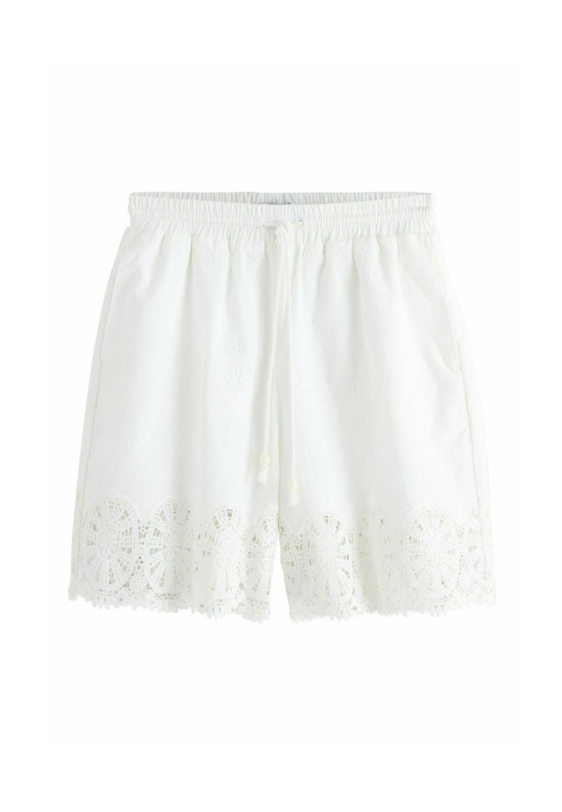 Short blanc à taille élastique avec cordon de serrage et dentelle délicate le long de l'ourlet.
