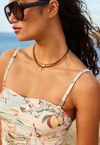 Femme portant un maillot de bain pastel sans bretelles avec un imprimé de fruits et de voiliers, de grandes lunettes de soleil et un collier, debout près d'une côte rocheuse et de la mer.