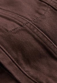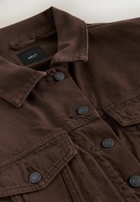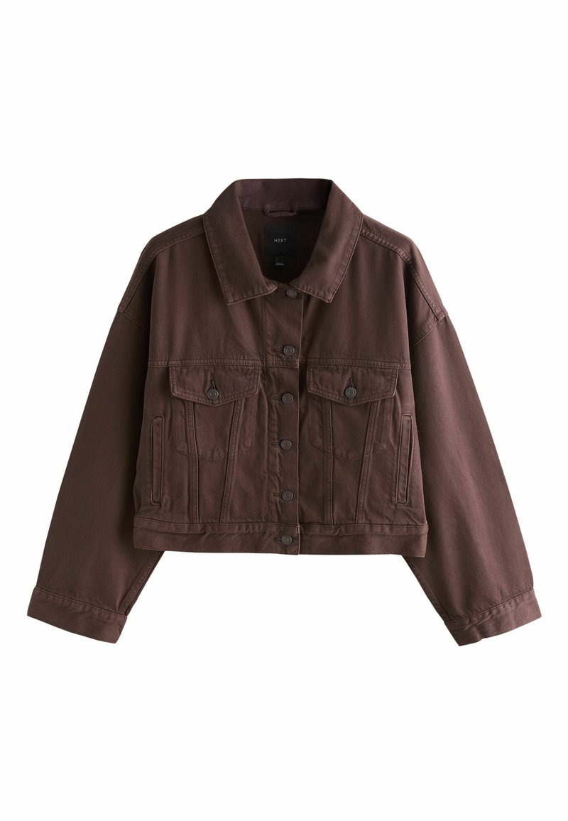 Veste en denim marron raccourcie avec fermeture à boutons, poches poitrine à rabat, poches latérales et manches longues.