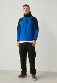 Jeune homme portant une veste à fermeture éclair bleue et noire avec capuche, t-shirt blanc et pantalon cargo noir devant un fond clair uni.