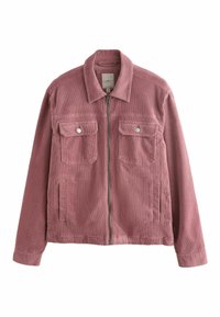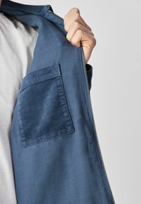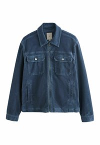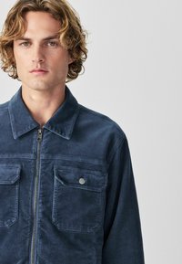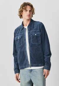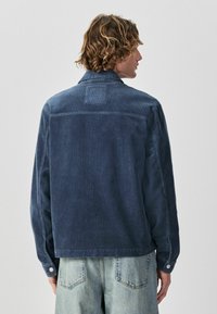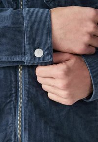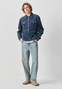 Jeune homme aux cheveux blonds ondulés portant une veste en velours côtelé bleue sur une chemise blanche et un jean bleu clair, debout devant un fond gris uni.