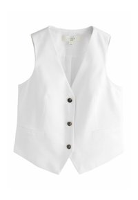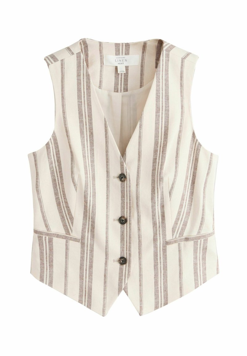 Gilet beige sans manches avec des rayures verticales marron, trois boutons sur le devant et deux poches frontales, en tissu de lin.