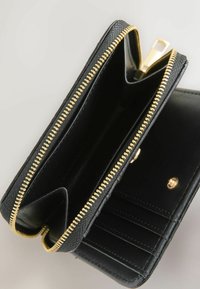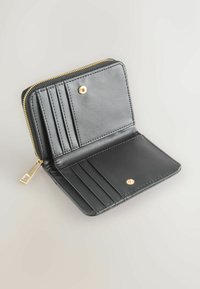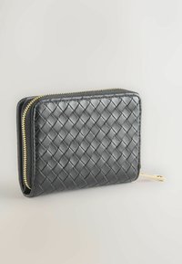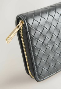 Portefeuille en cuir noir avec texture tissée et fermeture éclair dorée, présenté fermé sur un fond blanc.