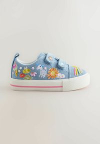 Baskets pour tout-petit bleu clair avec des bandes Velcro, décorées de motifs brodés colorés comprenant un soleil, une licorne, une abeille, une glace et des fleurs.