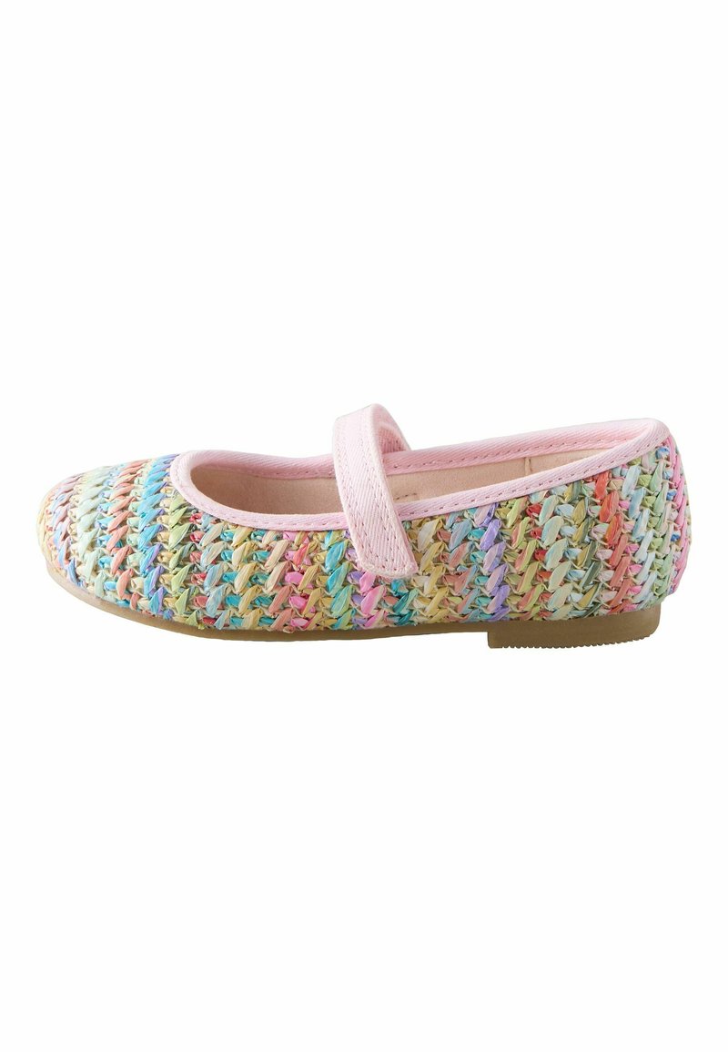 Chaussure plate pour tout-petit avec empeigne tissée multicolore pastel, bordure rose, bride rose sur le dessus et semelle en caoutchouc beige.