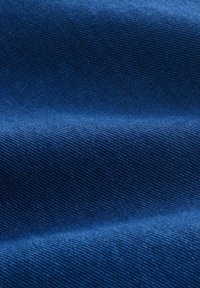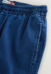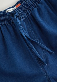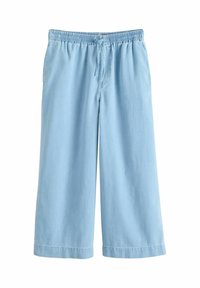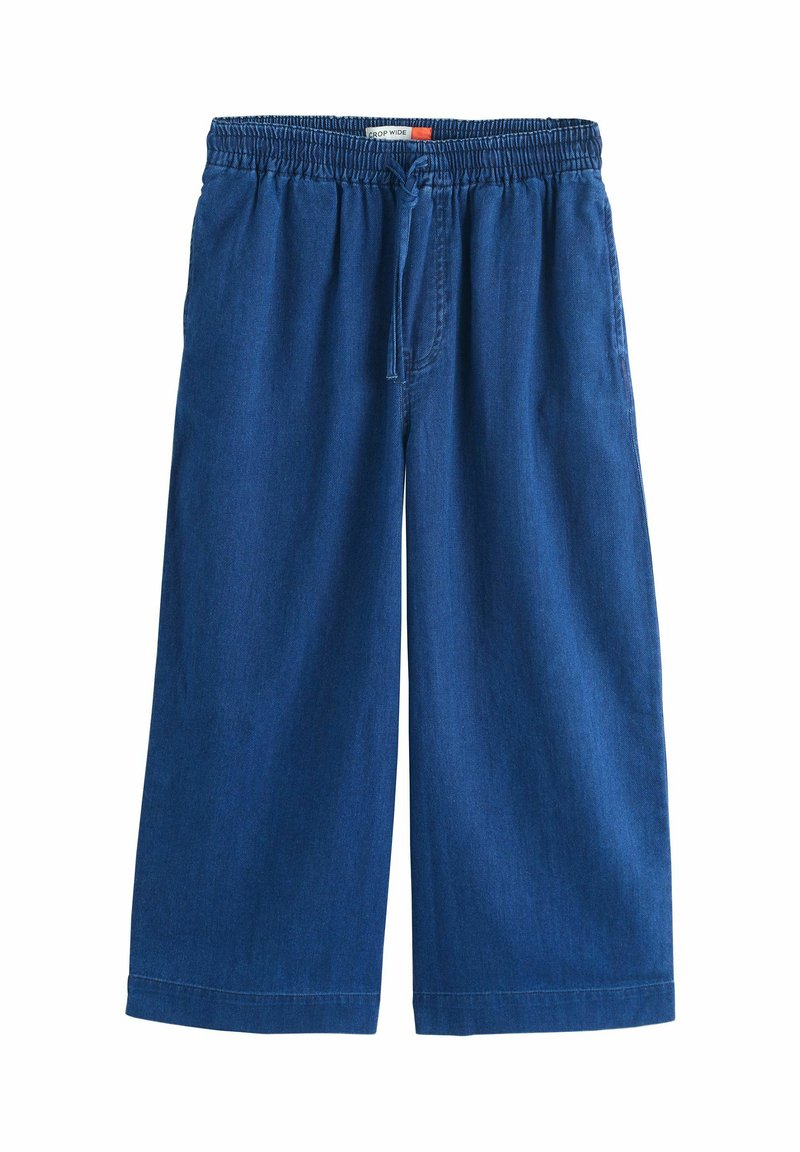 Pantalon en denim bleu coupé large et court, avec taille élastique et cordon de serrage, sans poches visibles ni ornements.