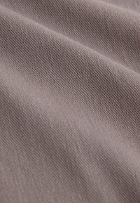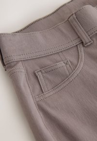 Pantalon large taupe avec passants de ceinture, poches avant et coutures apparentes.