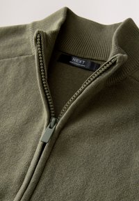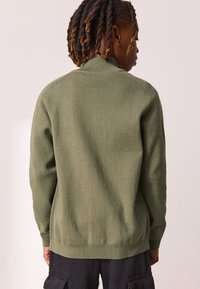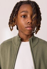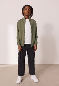 Jeune personne avec des dreadlocks mi-longs portant un pull zippé vert olive, un t-shirt blanc, un pantalon cargo noir et des baskets blanches.