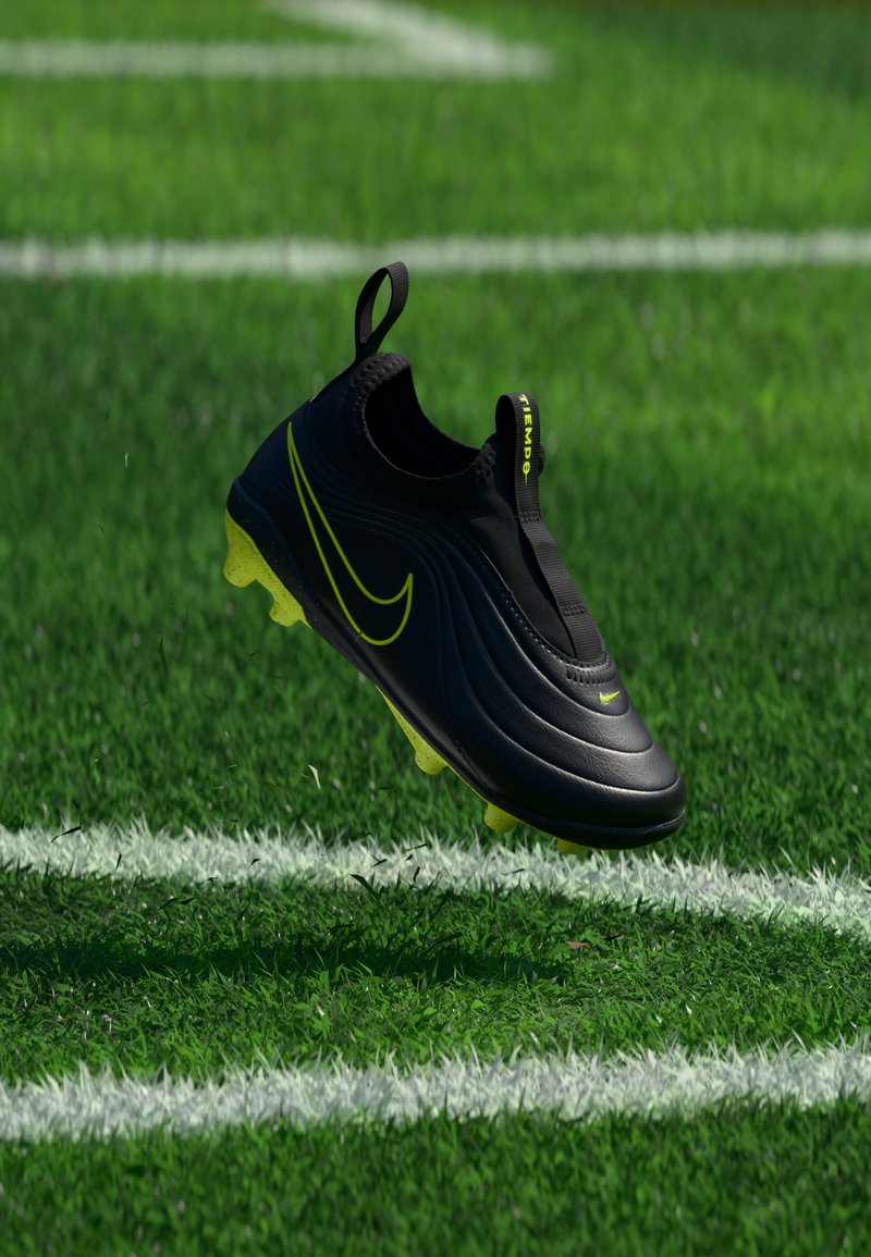 Crampon de football Nike noir et jaune néon flottant au-dessus d'un terrain en herbe verte avec des lignes blanches de délimitation.