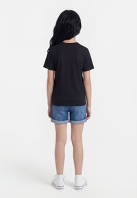 Fille debout portant un t-shirt noir avec un logo coq et étoiles, un short en jean bleu et des baskets montantes blanches sur fond blanc.