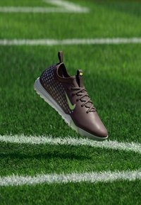 Baskets Nike marron foncé avec semelle blanche et points bleu clair flottant au-dessus d'herbe verte avec des lignes blanches de terrain.