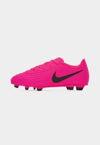 Crampon de football Nike rose vif avec logo swoosh noir et crampons moulés sur fond neutre.