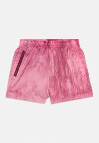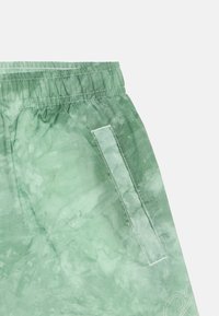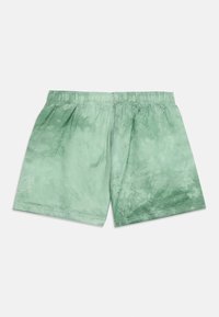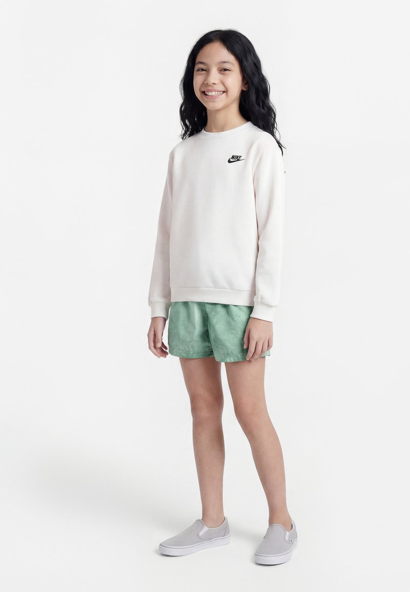 Fille souriante aux longs cheveux noirs, vêtue d'un sweat-shirt Nike blanc, d'un short vert et de chaussures grises sans lacets, posant devant un fond blanc.