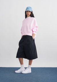 Femme portant un sweat-shirt Nike rose clair, une casquette Nike bleu denim, un pantalon noir, les mains dans les poches, debout devant un fond blanc uni.