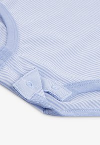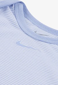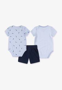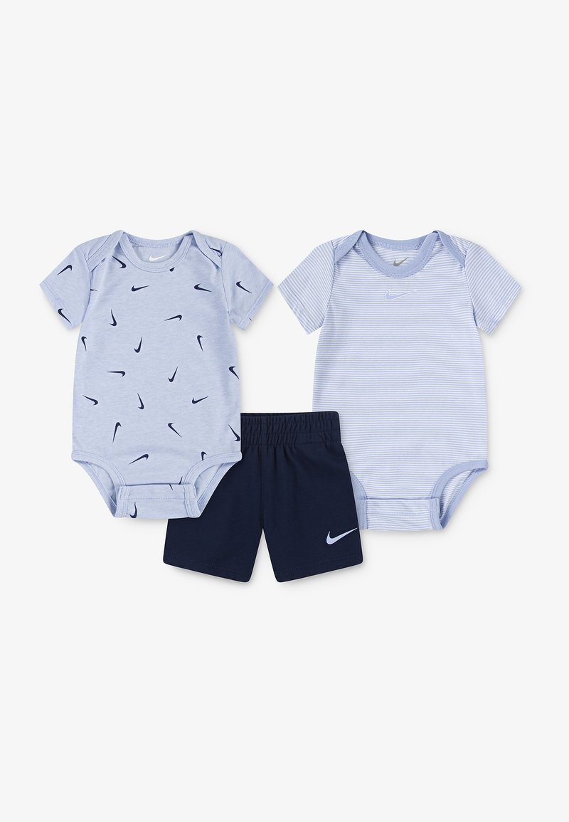 Deux bodys pour bébé Nike bleu clair—l'un avec un motif de virgule bleu marine, l'autre avec de fines rayures—et un short Nike bleu marine avec le logo virgule.