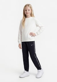 Jeune fille debout, main sur la hanche, portant un sweat-shirt blanc, un pantalon de jogging noir Nike avec bande logo et des baskets blanches sur fond blanc.